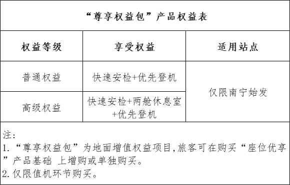 重点说明:除所购产品权益以及增购“尊享权益包”对应权益外不享受同舱位其他增值权益,如贵宾休息室、机上餐食、免费托运行李额等(国际航线升舱后按照升舱后舱位免费托运行李额执行)。