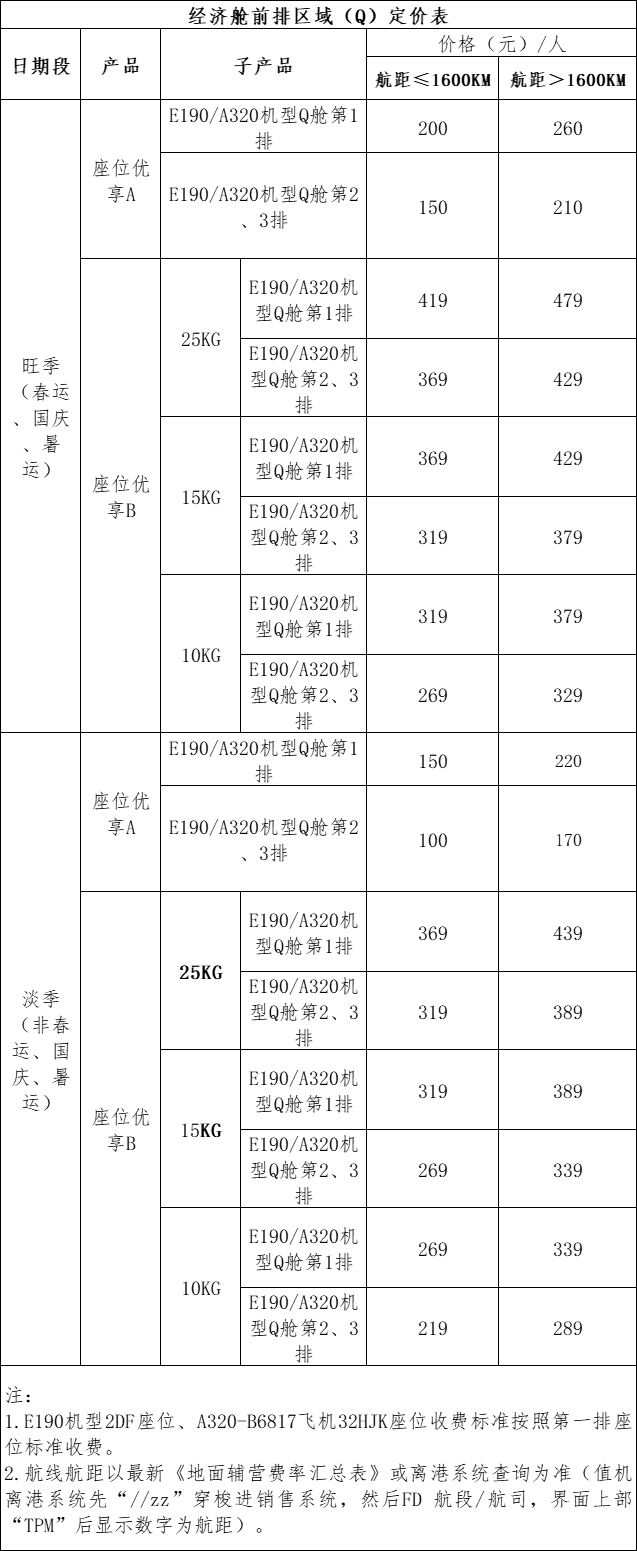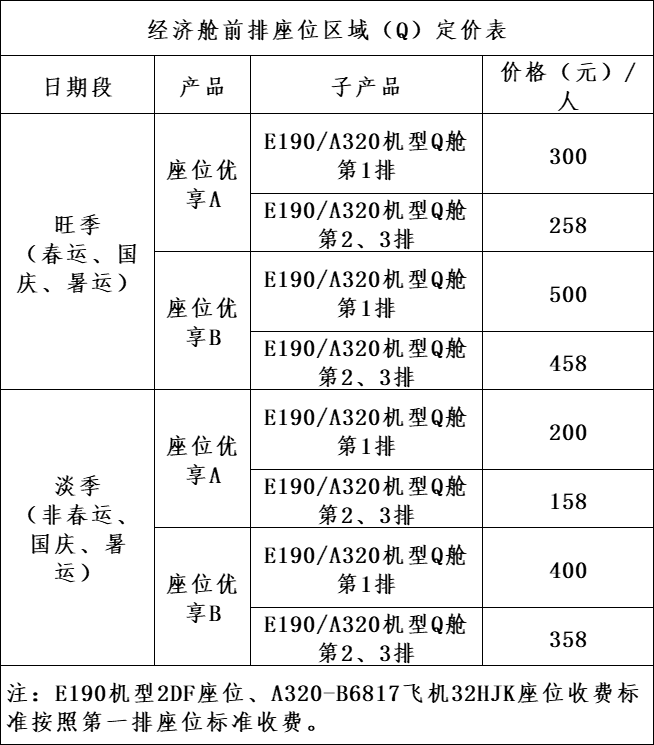 (一)升舱至Q舱:经济舱布局前三排座位;